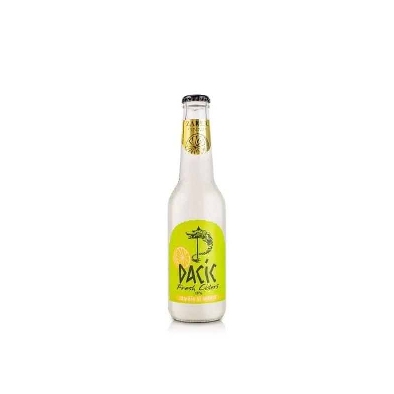DACIC Romanian Ciders Lămâie și Mentă este cidru românesc aromat inovator, ZAREA S.A., București, România, tradiție din 1912 (Wilhelm Mott fondează fabrică vin spumant, naționalizată 1948 sub numele ZAREA, lider național vinuri spumante). Expertiza 100+ ani fermentare vinuri și sucuri fructe. Gama DACIC lansată 2019, inspirată spiritul îndrăzneț al dacilor. Ingrediente: suc mere românești fermentate, aromă naturală lămâie, mentă, apă, zahăr, acid citric, CO2. Culoare galben-lămâie translucidă strălucitoare, carbonare vivace. Arome citrice intense lămâie fresh proaspătă zesty, mentă răcoritoare aromatic, mere dulci coapte fundal. Gust răcoritor tangy echilibrat: lămâie dominantă acidulată, mentă fresh cooling, dulceag mere, body mediu plin. Finalizare uscată persistentă fresh citric mentolat. Perfectă ultra-rece 5-7°C vară terase socializare prieteni. 4.5% alcool, sticlă 0.275L.